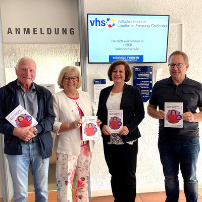 Rund 450 Kurse auf 220 Seiten – so präsentiert sich das neue Programmheft Herbst/Winter 2023/24, prall gefüllt mit Kursen, Seminaren, Workshops, Vorträgen, Wanderungen oder Kulturfahrten. Vhs-Geschäftsführer Michael Dietz: „Mit diesem vergleichsweise sehr umfangreichen Angebot, das sich über die Fachbereiche Gesellschaft, Kultur, Gesundheit, Sprachen und EDV/Digitalisierung erstreckt, erreichen wir wieder das Niveau vor der Corona-Krise.“ Wenn die Buchungen weiter so zu gut laufen, wie sich die Lage derzeit darstellt, könne das Vorkrisenniveau auch hier sogar übertroffen werden, ergänzt Willi Schindler, der der Volkshochschule als ehrenamtlicher Leiter vorsteht. Bei einem gemeinsamen „Streifzug“ durch das neue Kursprogramm zeigte sich stv. Landrätin Helga Weinberger von der Angebotsvielfalt beeindruckt. Weinberger: “Wir halten hier ein Programmheft in Händen, das unseren Landkreisbürgerinnen und – bürgern wirklich die Möglichkeit bietet, im Bereich der Erwachsenenbildung aus dem Vollen zu schöpfen.“ Daneben gibt es aber auch Kurse für Kinder und Jugendliche, wobei sich Helga Weinberger vor dem Hintergrund der abnehmenden Fähigkeit von Kindern, schwimmen zu können, über die vielen Schwimmkurse besonders freute. Die zahlenmäßig wichtigste Angebotssparte bei der Volkshochschule ist nach wie vor der Fachbereich Gesundheit, der ein Drittel aller Kursangebote ausmacht. Fachbereichsleiterin und stellvertretende Vhs-Geschäftsführerin Klara Köck gab einen Einblick in ihre Planungsarbeit und informierte dabei über einige Kursneuheiten. So wurde das ohnehin bereits umfangreiche Angebot mit Yogakursen um „Yoga für Schwangere“ und „Mutter-Kind-Yoga“ erweitert. Neu im Programm sind beispielsweise auch ein Seminar für Kräuterkunde, ein Kurs zum Erlernen der Technik des Jin Shin Jyutsu oder ein Männer-Kochkurs für die Generation über 55. Auch im kommenden Semester können Sprachbegeisterte wieder aus 13 Sprachen wählen, darunter einem neu ins Programme genommenen Online-Sprachkurs für Koreanisch. Einen Schwerpunkt bildet weiterhin eine breite Auswahl für Deutschlernende im Form von Integrationskursen, Grund- und Intensivkursen. Als einzige Institution im Landkreis nimmt die Volkshochschule zudem Einbürgerungstests ab. Michael Dietz, der den Fachbereich Beruf/EDV verantwortet, berichtet davon, dass neben einer Grundausbildung in den gängigen Office-Programmen Themen rund um die Digitalisierung im vhs-Programm immer mehr Raum greifen. So würden Angebote zu Fragen der Datensicherheit im Netz oder dem Erkennen von Shopping-Fallen und Fake-News gemacht. Erstmals aufgenommen wurde ein Vortrag, der für einen sicheren und geregelten Umgang mit dem digitalen Nachlass sensibilisiert. Einen Beitrag zur digitalen Teilhabe und Kompetenz gerade Älterer leistet die Volkshochschule mit einer ganzen Reihe von speziell auf Senioren abgestimmten Basis-Kursen zum Umgang mit PC, Tablet oder Handy. Neu im Programm sind vom Bayerischen Digitalministerium geförderte Handysprechstunden, bei denen junge Menschen Älteren praxisorientiert in bewusst zwangloser Atmosphäre alle Fragen zur Nutzung des eigenen Gerätes beantworten.