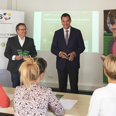 Die vhs und das Tourismusreferat des Landkreises Freyung-Grafenau legen zum nunmehr 2. Mal eine Fortbildungsreihe für touristische Leistungsträger auf. Der Werbeflyer zum Kursprogramm, das im Oktober startet, wurde im Beisein von Landrat Sebastian Gruber, vhs-Geschäftsführer Michael Dietz und Tourismusreferent Bernhard Hain im vhs-Seminarzentrum Freyung der Öffentlichkeit vorgestellt.
