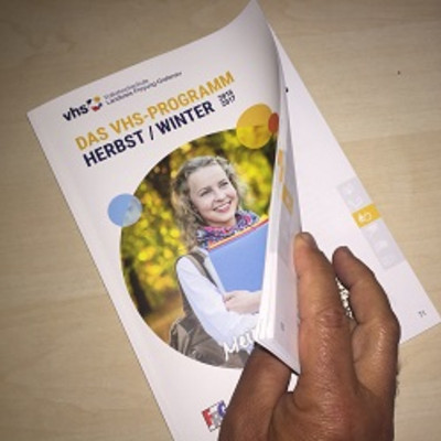 Das vhs-Blätterprogramm "zum Anfassen" ist soeben druckfrisch erschienen und liegt ab sofort bei allen Banken und Sparkassen, den Gemeindeverwaltungen sowie an vielen weiteren Auslagestellen im Landkreis auf. Einfach kostenlos mitnehmen und zu Hause in Ruhe durchblättern. Neben 500 Kursangeboten finden Sie im Programmheft alle Infos zu Anmeldung und Buchung.