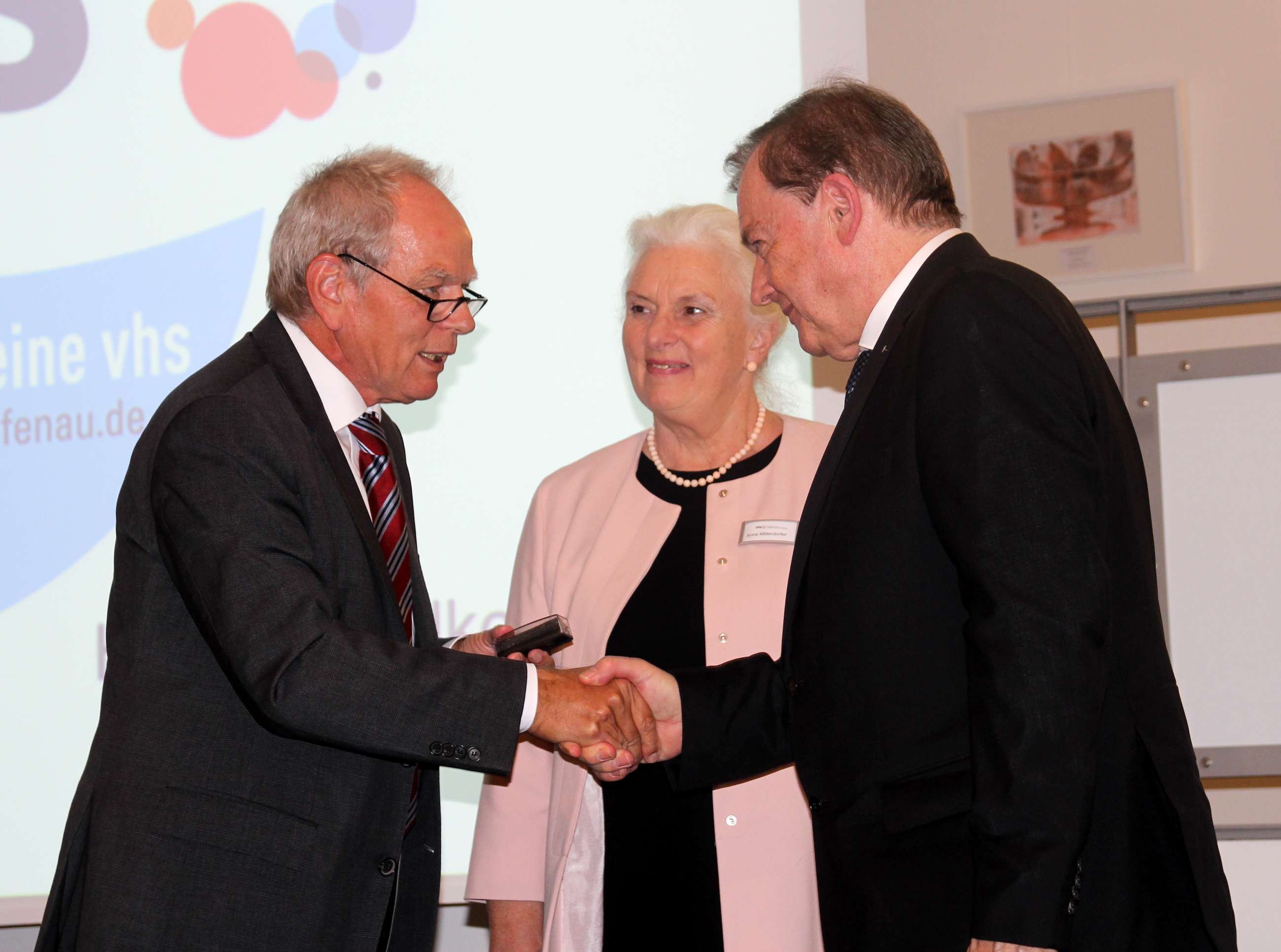 Am Rande der Veranstaltung ehrte der Verbandsvorsitzende im Beisein von Ehrenamtlicher vhs-Leiterin Anna Mitterdorfer den scheidenden vhs-Geschäftsleiter Klaus Hippmann mit der Goldenen Ehrennadel des bvv (Foto).